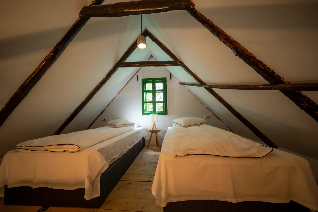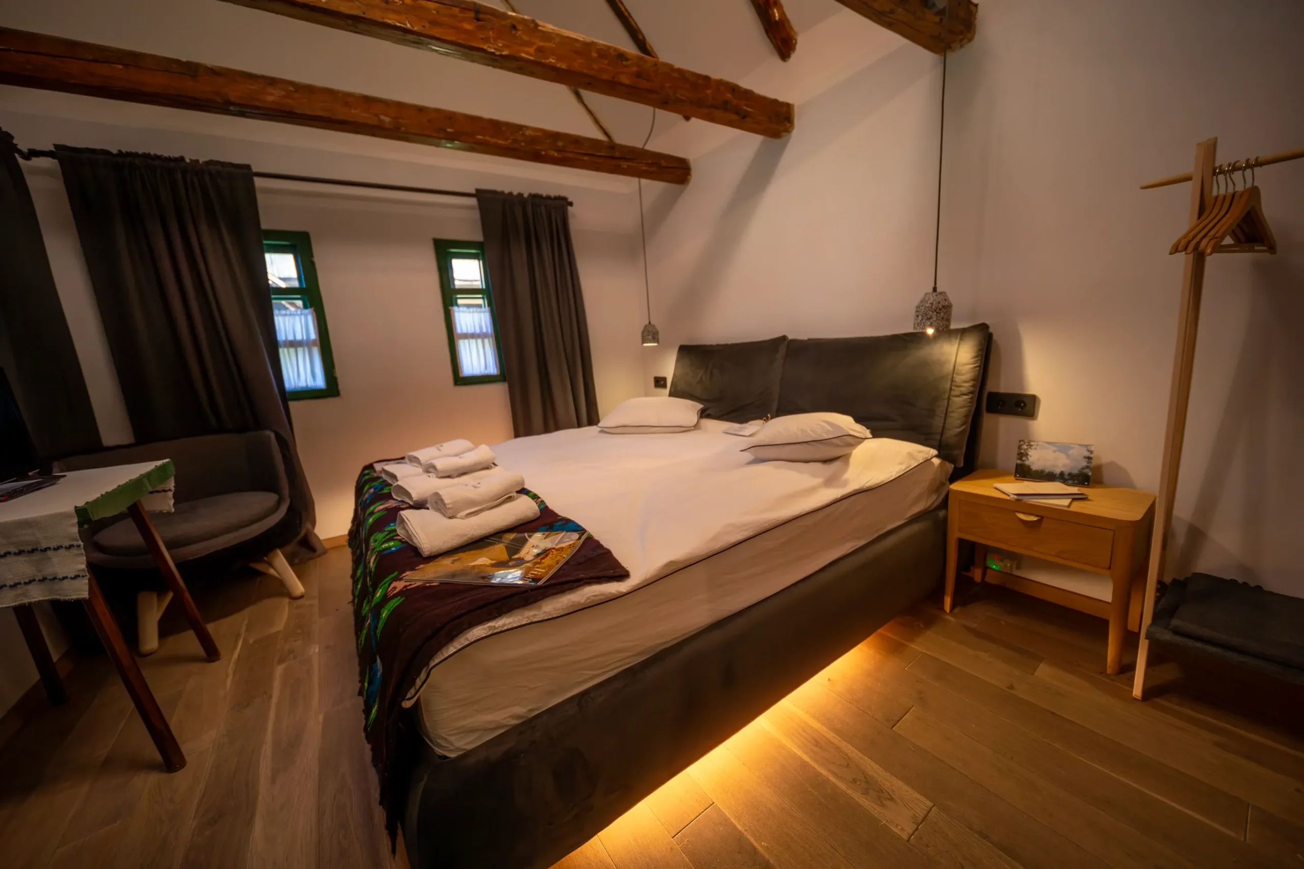 Ambele camere oferă spațiu generos, paturi matrimoniale confortabile, mobilier tradițional restaurat și o lumină caldă, controlată. Pereții din lemn întunecat dau senzația de protecție și intimitate.