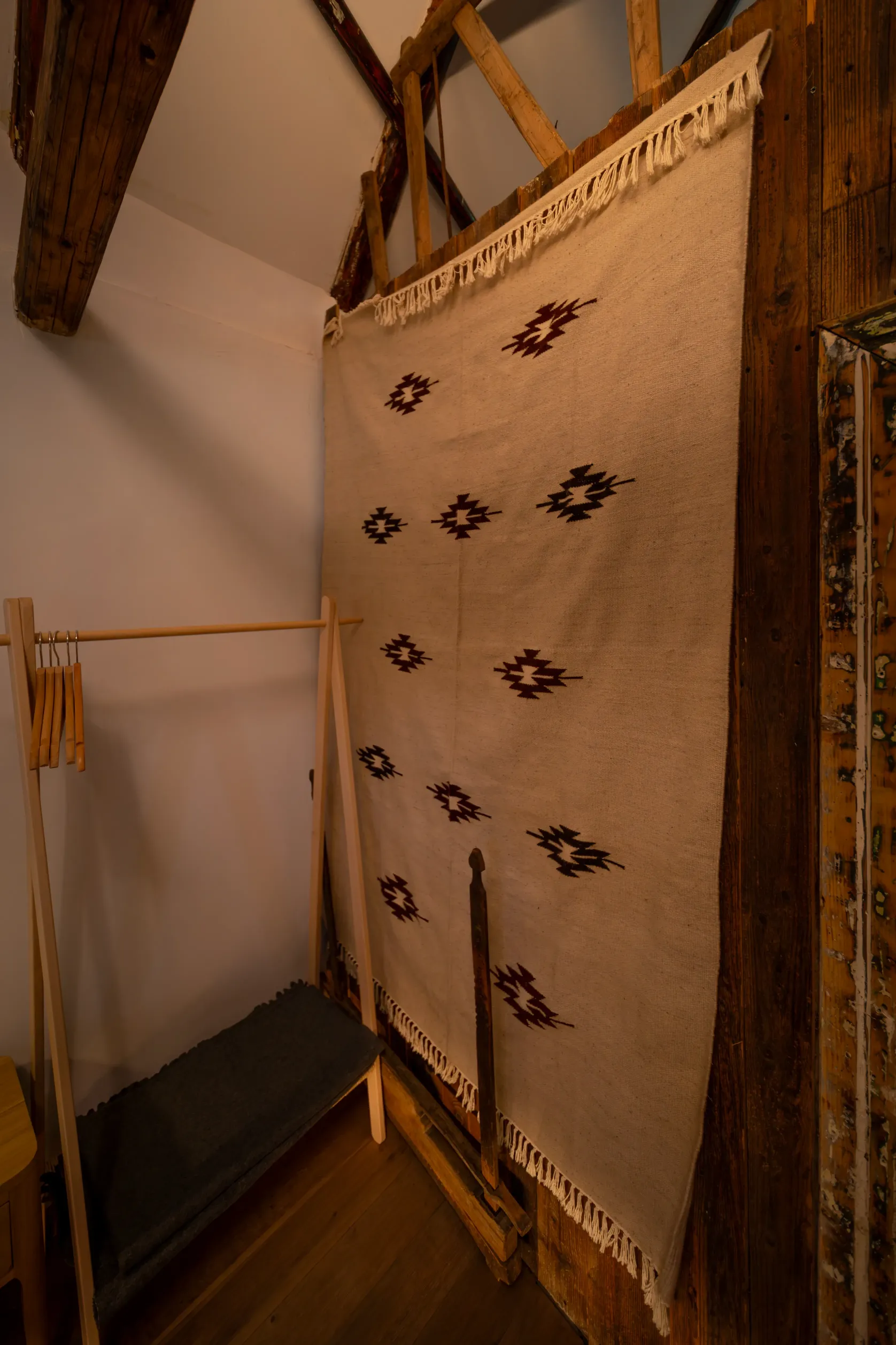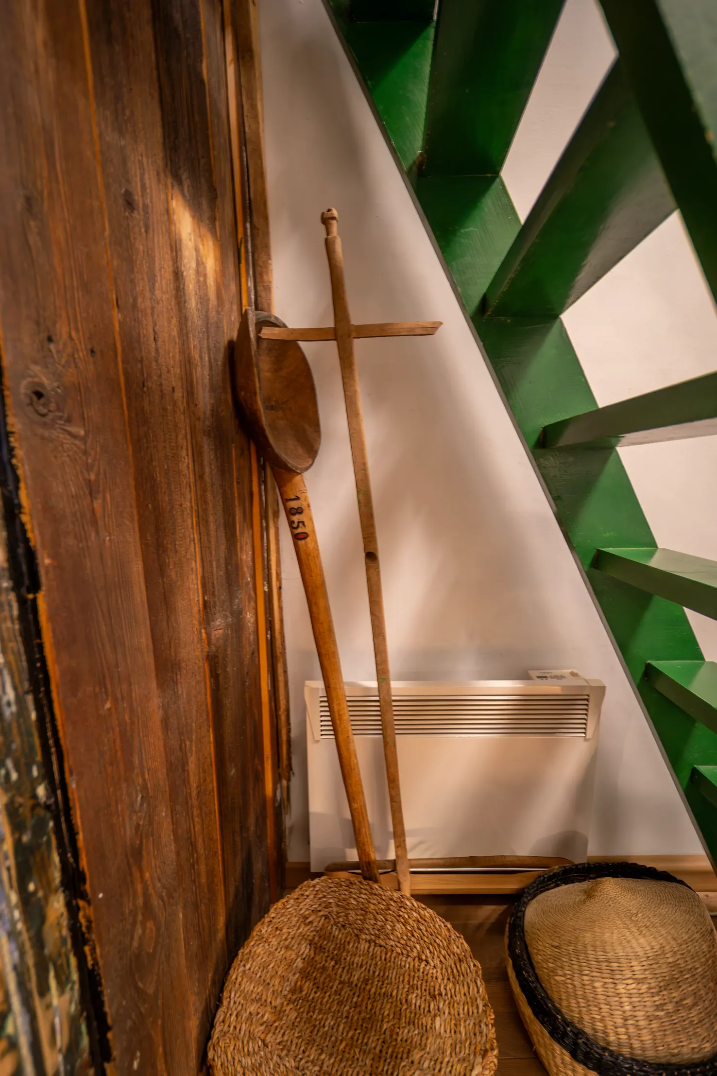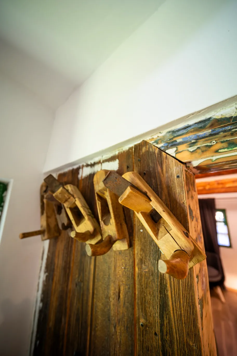 Încă de la intrare, detaliile îți sugerează: urmează o experiență puternică. O rindea expusă pe perete, o oglindă veche cu cadru de fier, o bancă rustică din lemn masiv. Fiecare element are rolul său.